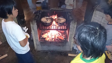 そして夕食の支度となりました。薪を使って火をお越し、大きなポットにカレーとご飯を作り、サラダを添えました